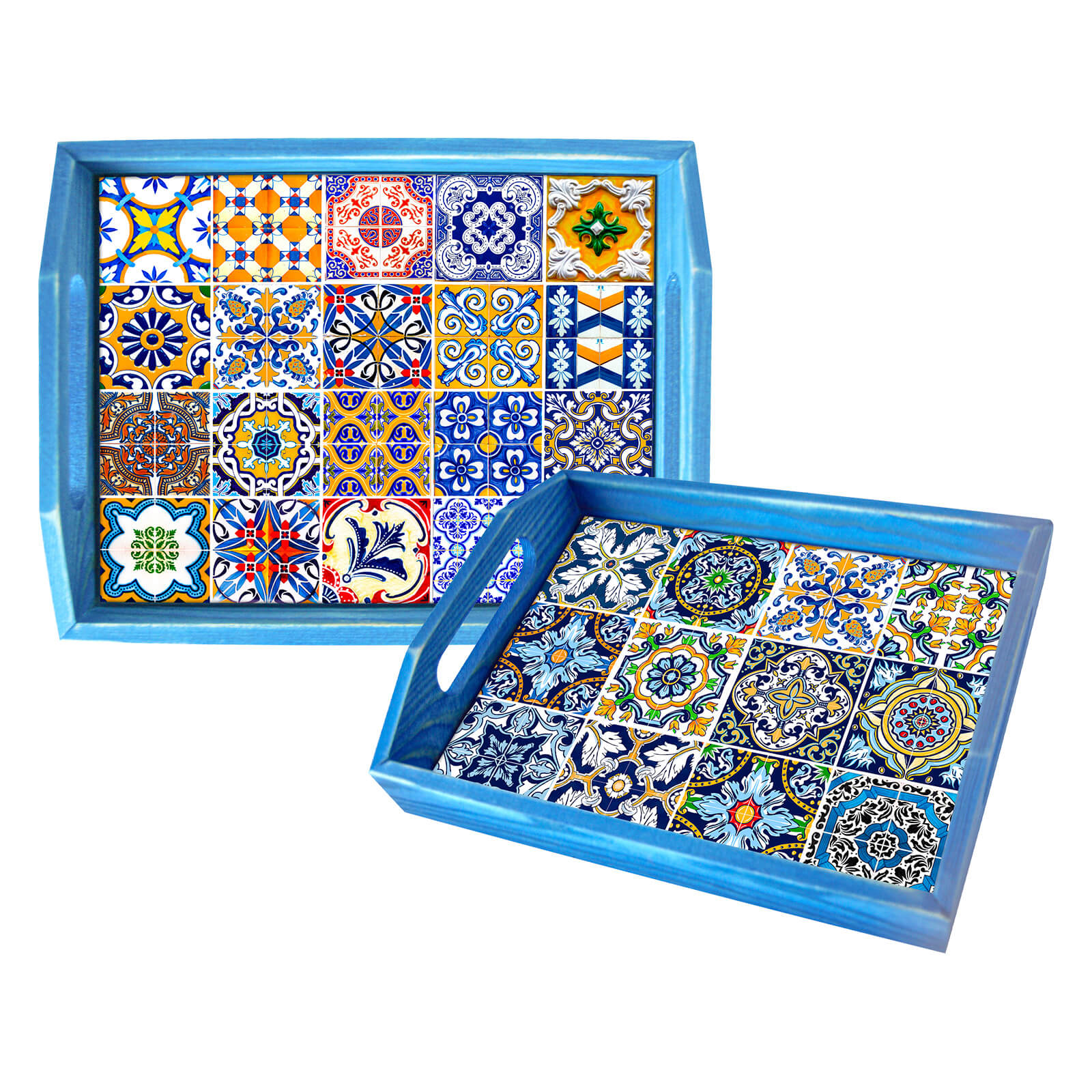 Tabuleiro de Madeira Azul Retangular com Azulejo